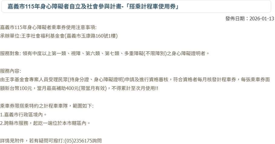 圖片六:嘉義市115年身心障礙者乘車券
