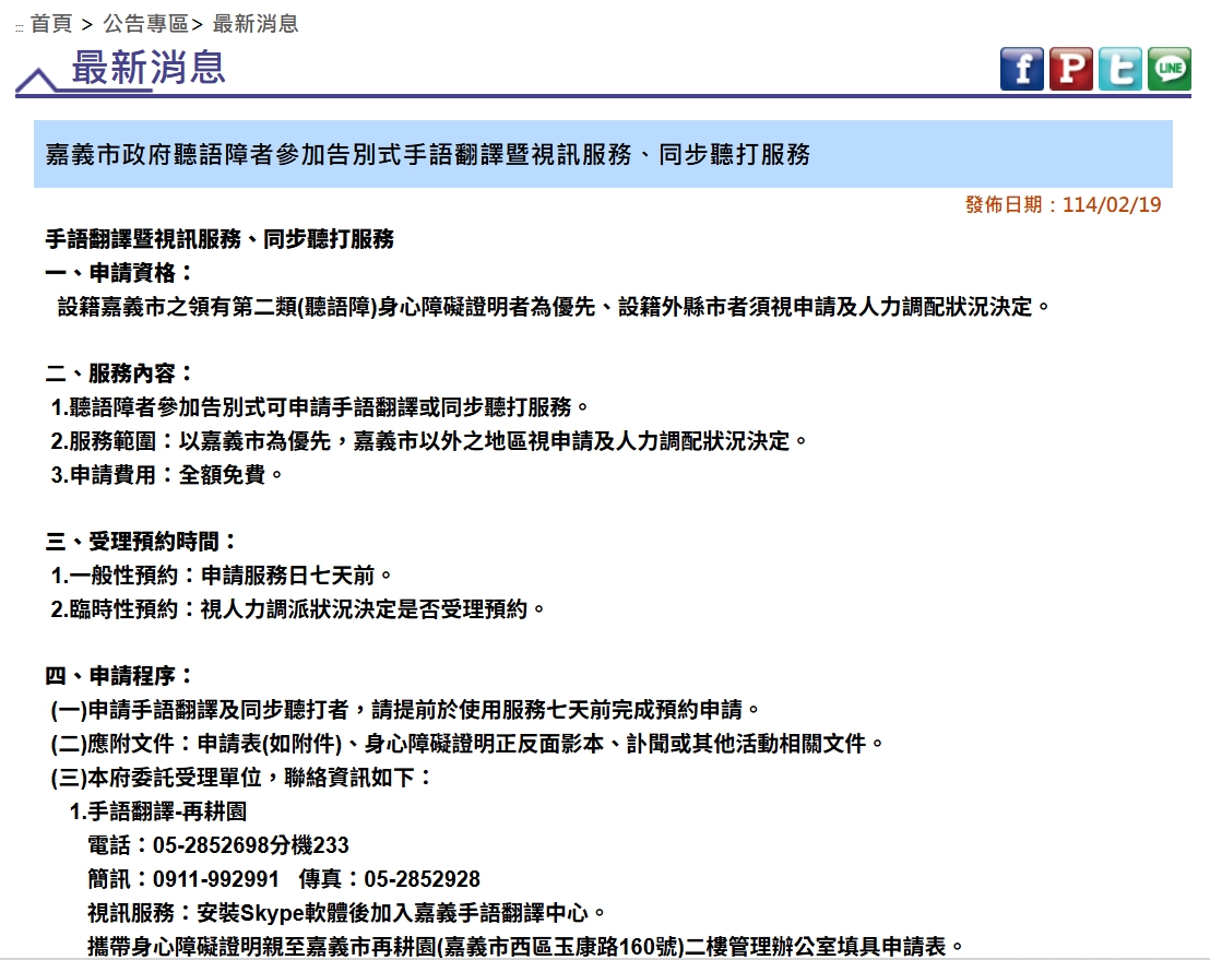 (首頁/公告專區/最新消息/嘉義市政府聽語障者參加告別式手語翻譯暨視訊服務、同步聽打服務)