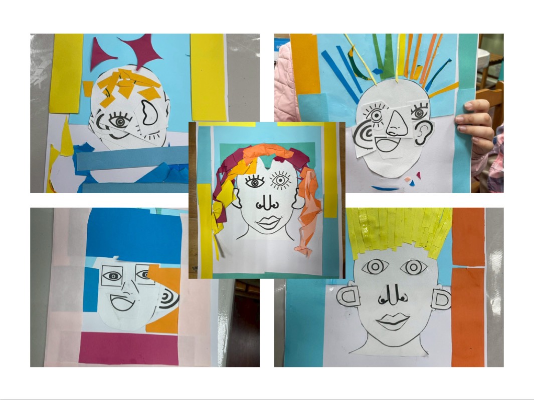 教室裡,孩子們延續上一堂課對五官的細膩觀察,開始進行臉譜拼貼創作。這不僅僅是媒材的堆疊,更是一場心理探索。有人大膽地打破了對稱,用不規則的形狀拼湊出充滿個性的臉龐;有人則像塔克一樣,沈浸在拼貼的樂趣中,不在乎標準答案,只在乎色彩與心情的跳躍。