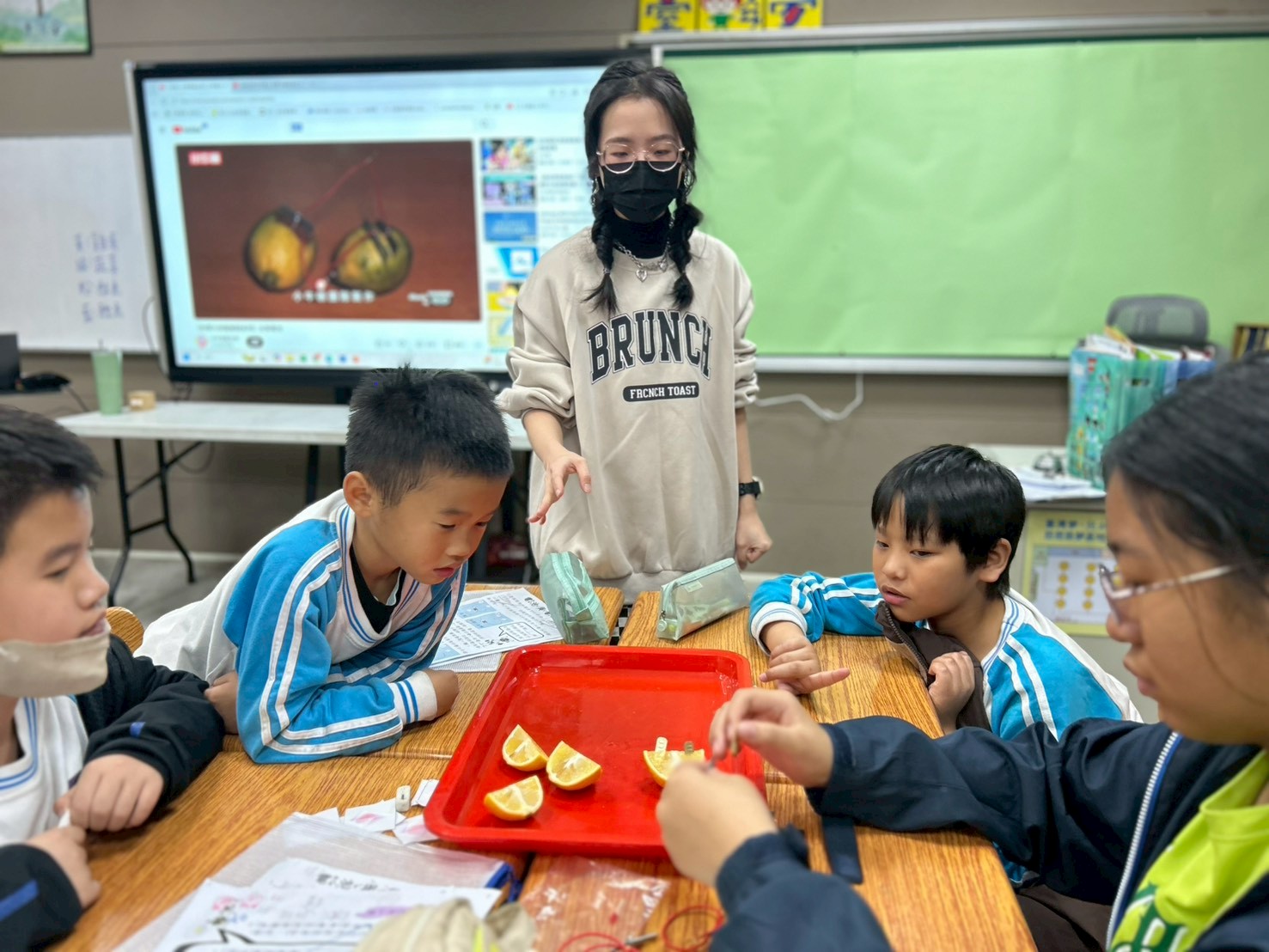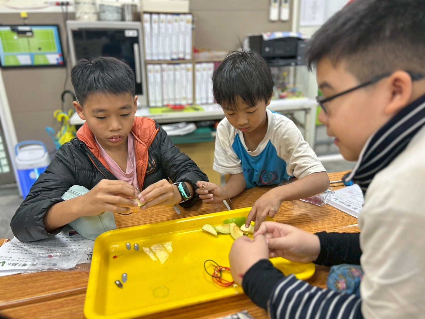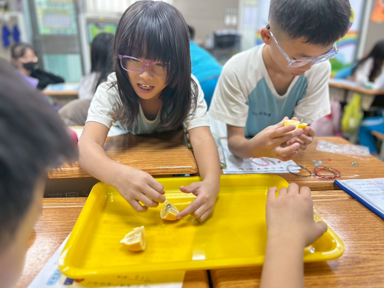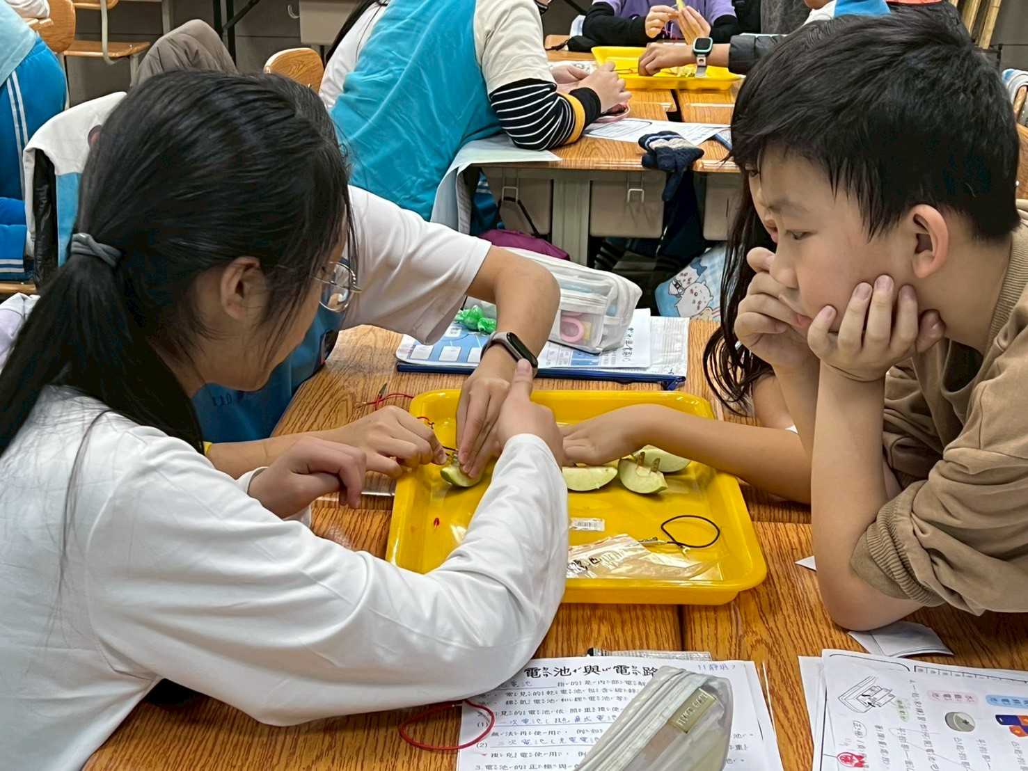 水果電池,沒聽過吧,光是這個詞就已經夠吸引孩子們的興趣,感覺怪怪的,似乎大家都這麼想,可能嗎?這些疑惑,早在老師的意料中,沒關係,老師來畫龍點睛,其他的,就要孩子們自己動腦去想,動手去做囉!於是,教室裡,此起彼落,這邊"哎呀"一聲,浩歎不已,然後再接再厲;那邊"於呼"一聲,大叫著,"燈亮了",開心地手舞足蹈。