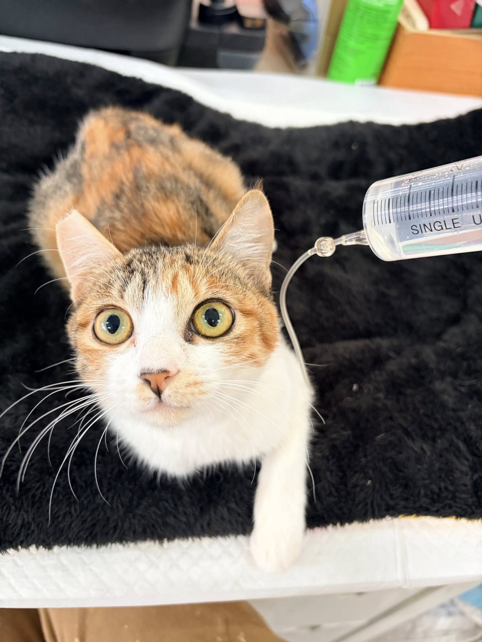 目前靜香仍在與肺炎對抗,食慾一直不太理想,需要打點滴補充水分,也會灌食維持體力。每一天,我們都密切注意她的呼吸狀況,只希望她能少一點不舒服,多一點力氣慢慢恢復。