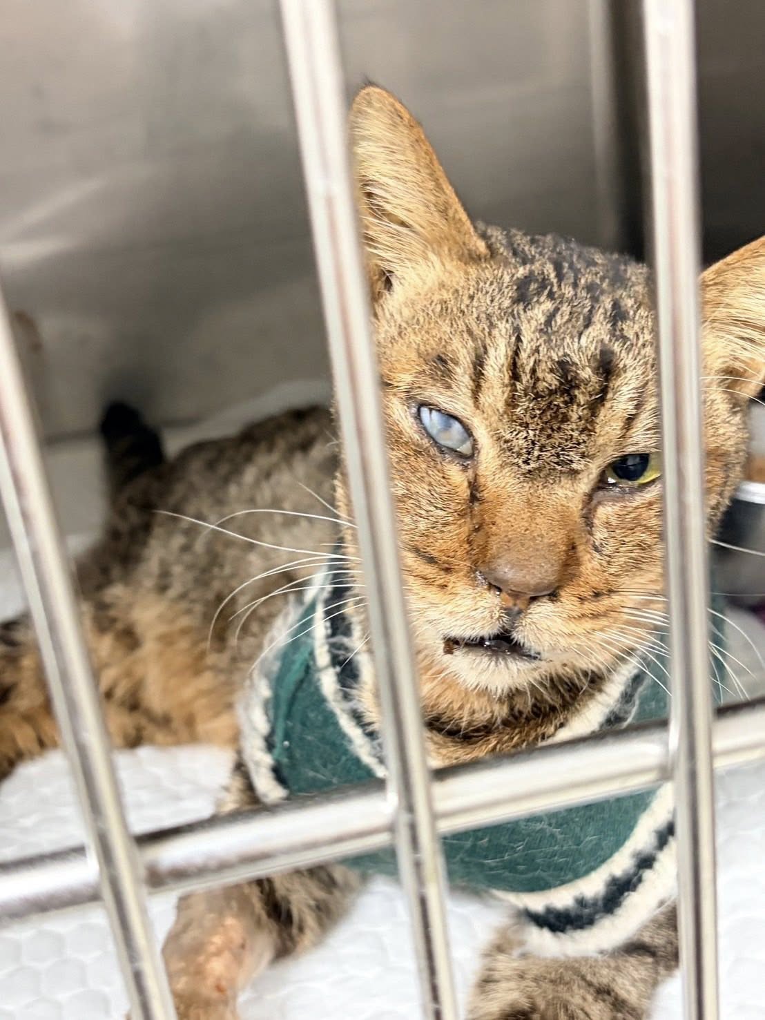 圖上: 靜香,是我們在進行結紮誘捕的孩子。原本是希望順利完成手術後讓她回到原本的生活,但在照護過程中發現,她的身體狀況並不理想,特別容易感冒,因此才一直留在協會持續觀察與照顧。