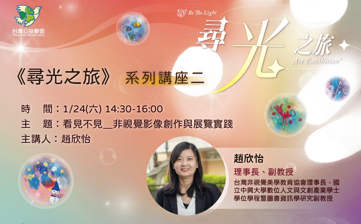 2026 年 1 月 24 日,本會理事長趙欣怡博士受邀於「龍山藝術宮」發表專題講座。本次講座以 2024 年協會主辦的「《欲見心象》非視覺攝影創作課程」為核心案例,深度解析了視障青年如何透過多感官引導與 AI 科技,突破視覺限制,創造出屬於自己的影像語言。