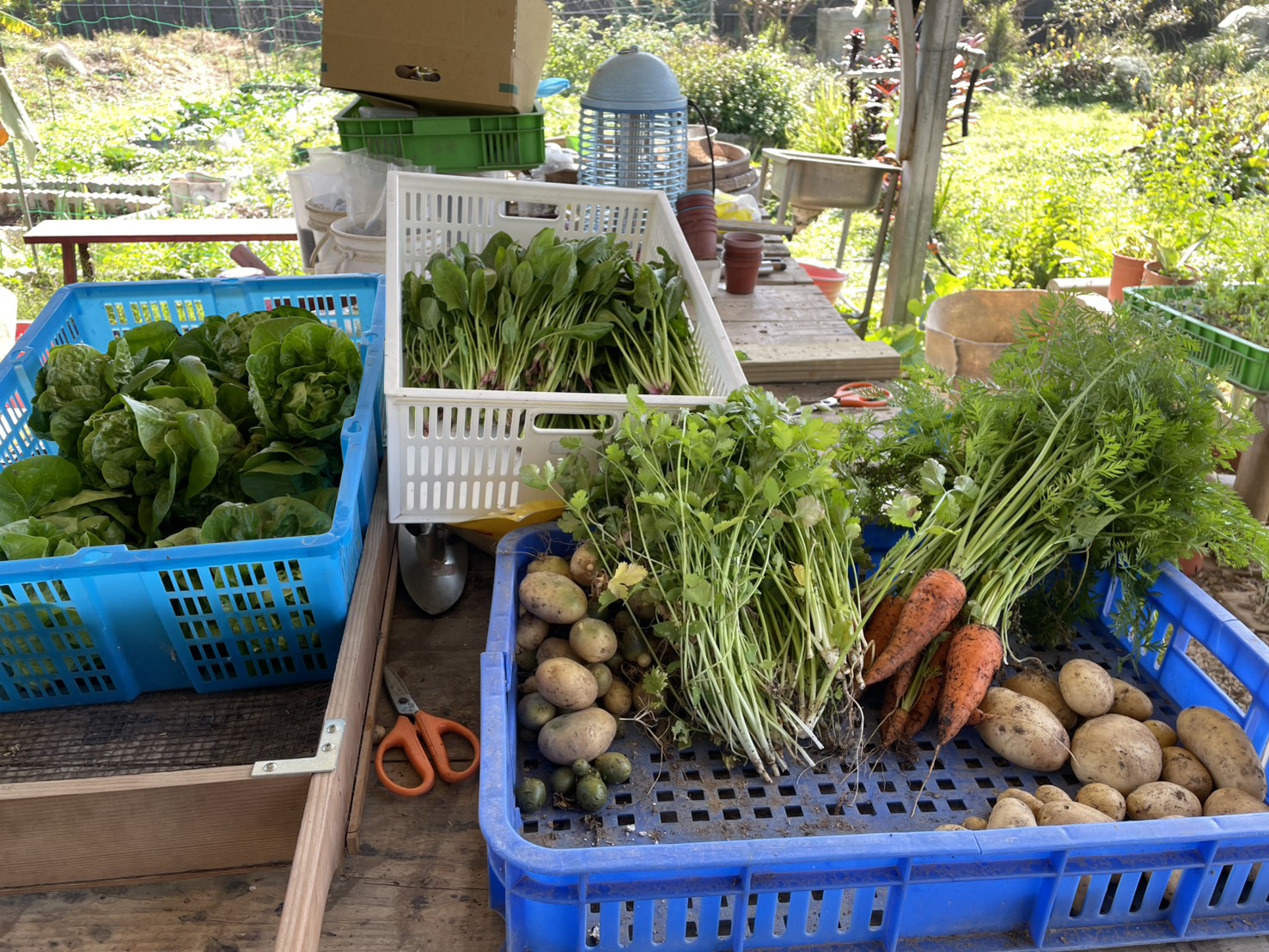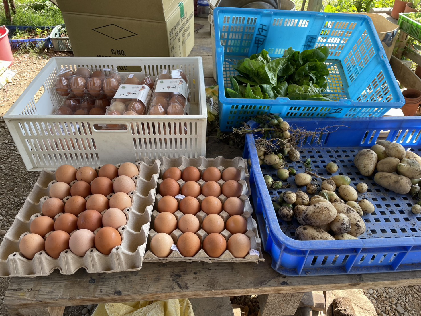 又是趕著送貨的日子,趕緊將農地上有的菠菜,紅蘿蔔,高麗菜,綠寶石,馬鈴薯採摘下來,然後分裝給買家。同時將蛋給裝盒起來,話說我們家的雞不知道是吃得飽飽還是因為年紀大了以至於生下的蛋都比之前大好多,導致蛋盒都裝不下,得買更大加厚加大的蛋盒才行裝下。哈哈,感謝雞兒們和大地給予我們好多食物可以吃,也有好多美麗的事物在眼前讓心情開朗。