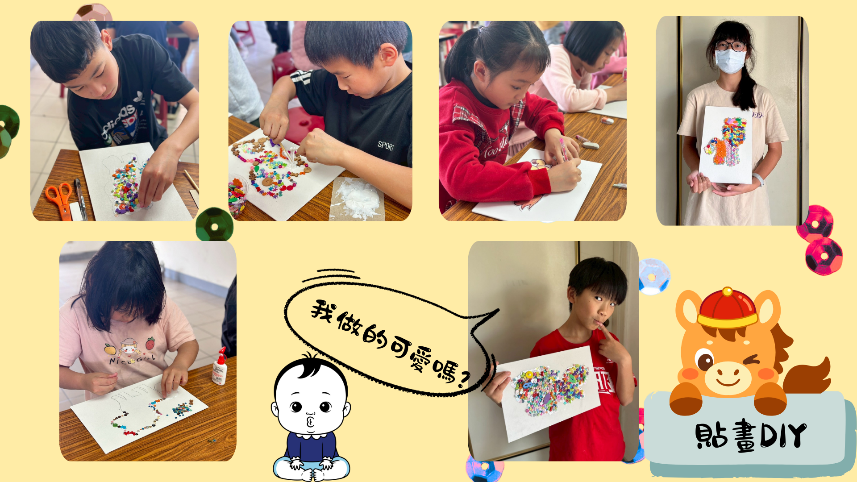 老師帶著小天使們一起進行「馬年春聯製作」。這可不是一般的寫字春聯喔!小天使們發揮無限的巧思,利用剪貼與色彩繽紛的毛根去做裝飾,把原本平面的紙張,變成了立體又生動的藝術品!有人凹出了可愛的橘子,有人貼滿了福氣的圖案。🎨
