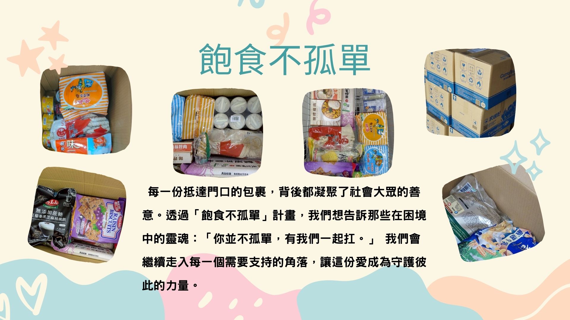 這個月,「飽食不孤單」計畫走進了 70 個家門。不僅是提供飽腹的米糧,更是我們對社會邊緣處的聲聲回應—讓那些在困境中孤軍奮戰的人知道:有人在乎,有人掛念。