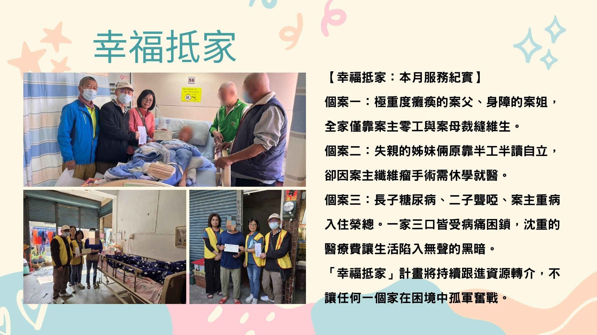 「在訪視的路上,我們走進了三個被現實磨難困鎖的角落:有家庭正守著縫紉機,試圖在日夜趕工中補齊極重度癱瘓與身障帶來的醫耗缺口;有原本堅強自立、半工半讀的姊妹,卻因一場手術與病痛,不得不按下求學夢的暫停鍵,在醫院長廊裡迷失了方向;更有在無聲世界中,因糖尿病、白內障與重病接連打擊而搖搖欲墜的沈默家庭。這些家門後的嘆息,交織著貧窮與病苦的重擔,讓生活只剩下精疲力竭的苦撐,正急切地等待一份溫暖的接住與光亮的照耀。」我們深知,物資與救助金僅是這場長跑的「第一站」。