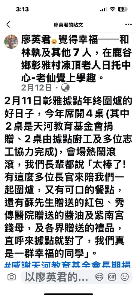 感謝您每月的愛心支持,正因為有您的穩定捐助,彰雅社區巷弄長照站的長輩們才能天天享用營養補充品與熱騰騰的午餐及交通車接送服務,更有精神參與據點課程與活動。