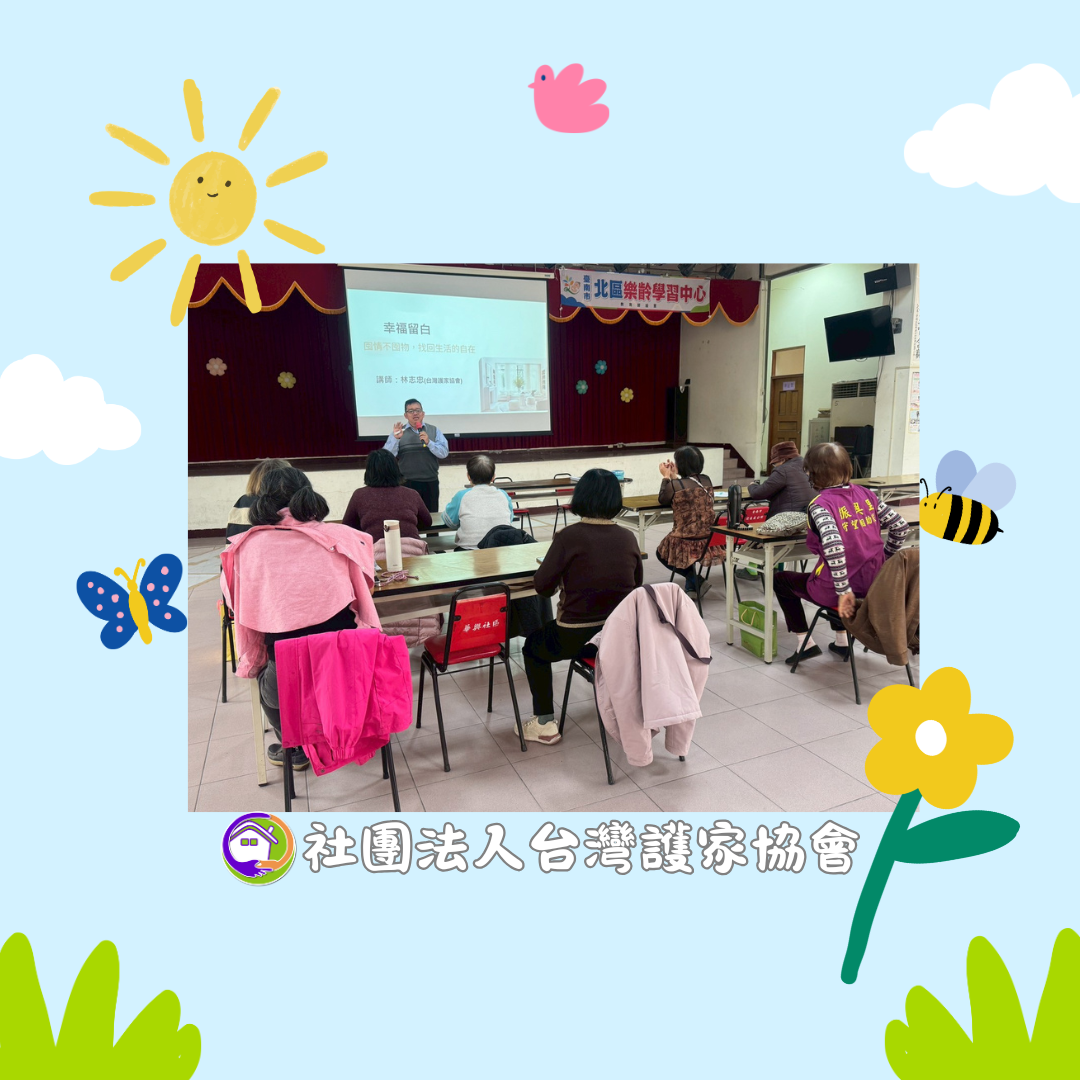 2月4日下午,護家協會執行長與夥伴走進台南市北區振興里活動中心,陪伴長輩聊一個生活中的情況,為什麼許多已經用不到的物品會捨不得丟?透過活動帶領長輩將身邊物品與內在情感分開寫下來後,大家慢慢發現:留下的不是東西,而是回憶。長輩說:「情感,其實重於物品。」這些物品可能是父母留下來的衣物,可能是孩子成長過程中有紀念性的物品,可能是個人成長奮鬥歷程中的紀錄,都在內心佔有重要地位。