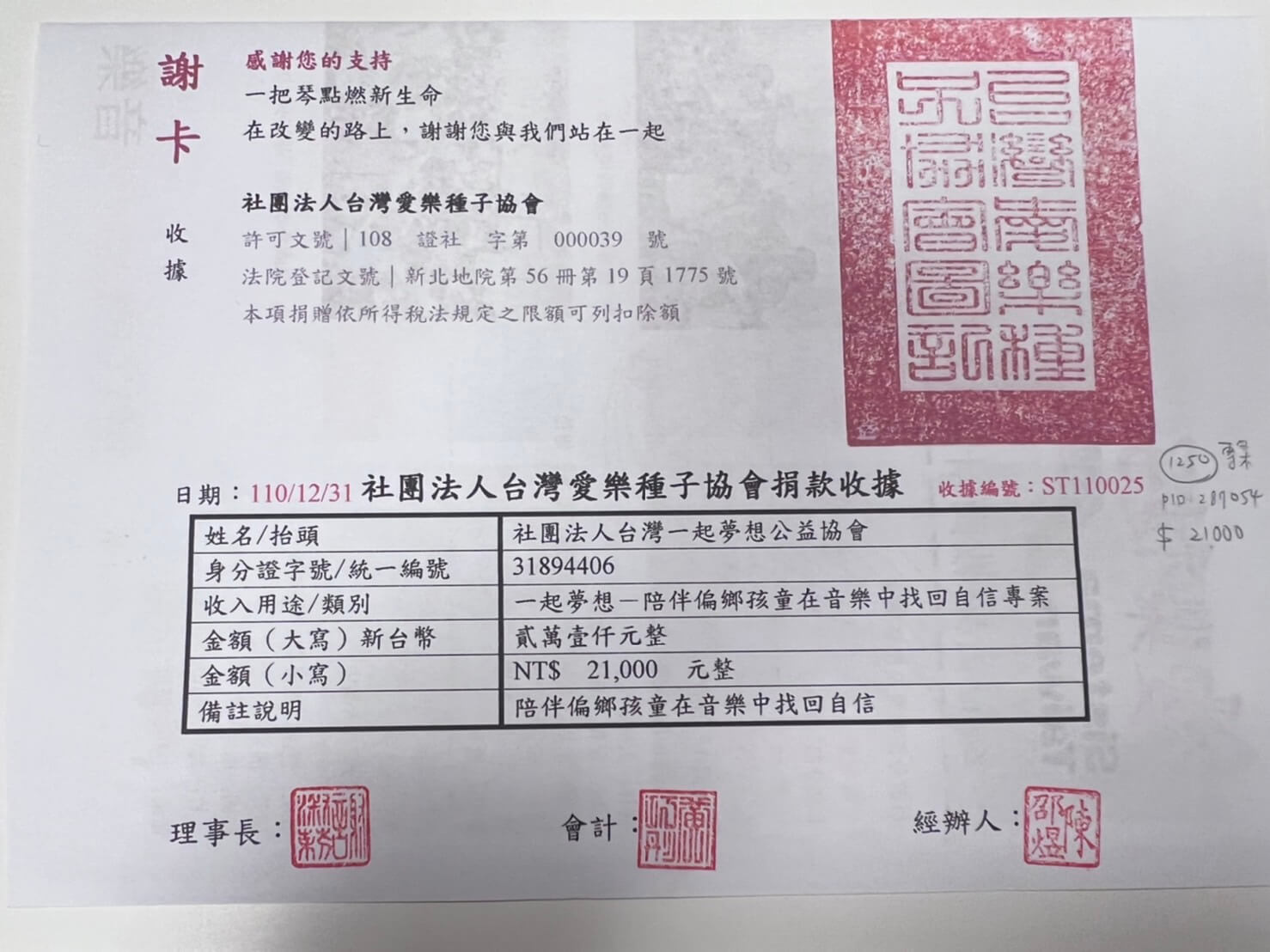 【一起夢想-陪伴偏鄉孩童在音樂中找回自信】總計募得 21000 元,達成率 23 %, 並於 1月11日 100% 匯給「社團法人台灣愛樂種子協會」專款專用,支持70位偏鄉孩童提起琴弓、站上舞台勇敢築夢!